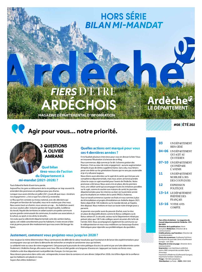 Depuis 2022, en tant qu’animateur et innovateur territorial, le Département s’est ainsi attaché à mettre en œuvre des solutions développées en synergies avec tous les acteurs concernés. Parmi les objectifs visés : l’installation de 100 médecins généralistes en Ardèche d’ici 2027, la multiplication des maisons de santé et une politique incitative tournée vers les internes en médecine… Dernière action en date : l’ouverture d’une année Pass (Parcours d’accès spécifique Santé) à Aubenas à la rentrée de septembre 2025, une formation inédite en Ardèche qui prépare aux métiers de la santé.