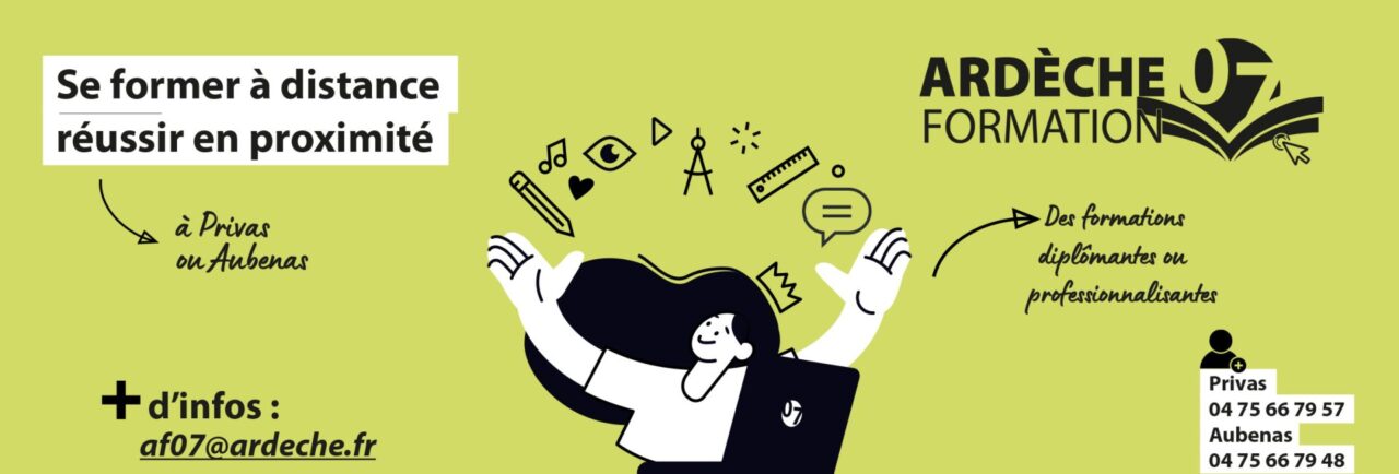 L’insertion par l’emploi et l’enseignement supérieur sont une préoccupation du Département. C’est pourquoi Ardèche formation 07, AF07 accompagne une quarantaine de personnes désireuses de se former à distance. AF07 propose un accompagnement personnalisé et un lieu de formation équipé pour poursuivre sereinement et efficacement une formation diplômante.